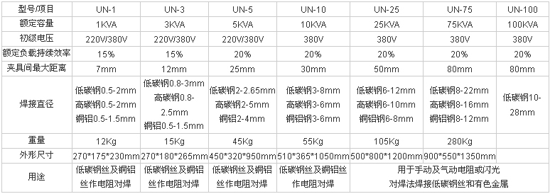 UN-5型对焊机,UN系列对焊机用电阻焊接法和闪光对焊法实现对低碳钢,中碳钢,高碳钢及有色金属的各种丝,棒,环,板,管等型材的焊接.它的设计合理,质量可靠,操作方便,工作地点灵活,焊工容易掌握.顶煅力,钳口距离,电流大小可根据需要方便调整,可自动送料和手工送料.